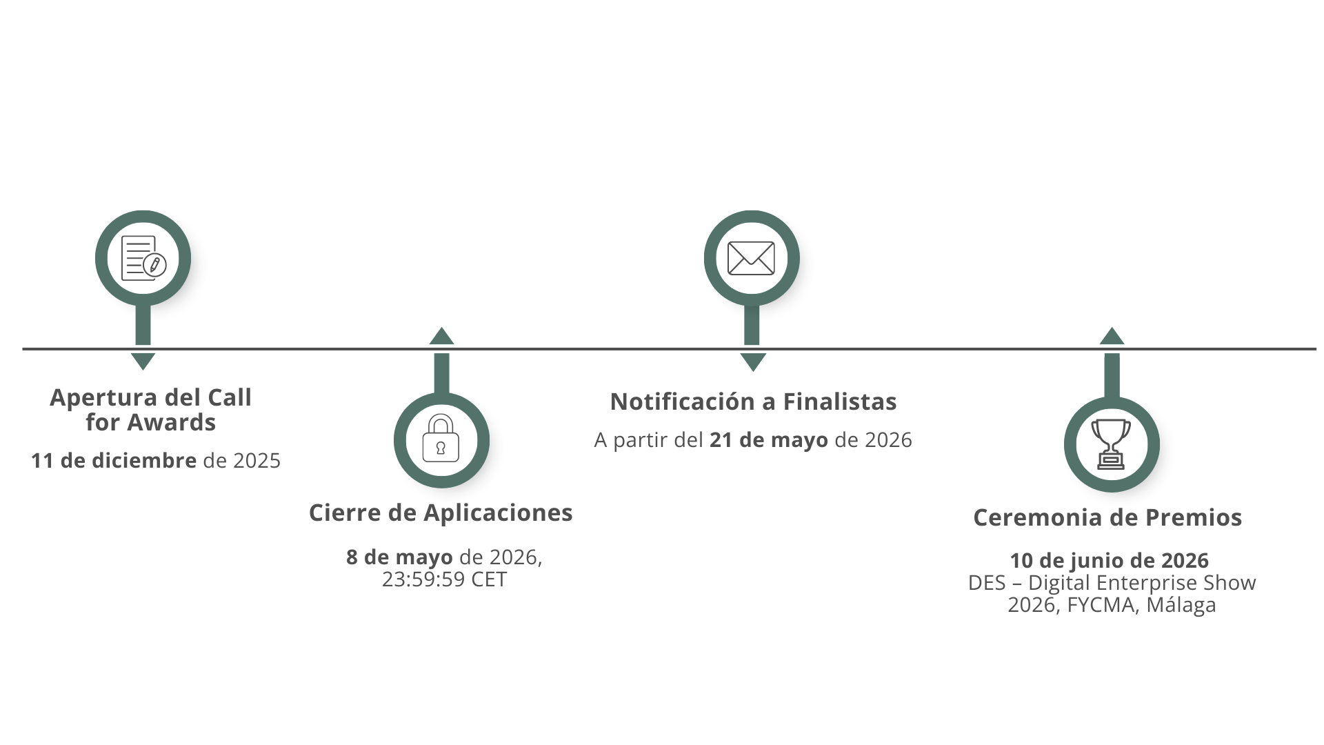 Recibe el reconocimiento de todo el sector tecnológico y empresarial en una gala muy especial que tendrá lugar el 10 de junio de 2026 dentro del marco del DES – Digital Enterprise Show 2026 en FYCMA, Málaga, ante profesionales y directivos del sector. Los ganadores tendrán una oportunidad única de mostrar sus proyectos innovadores al mundo, colocándolos en el foco de una plataforma de referencia internacional.