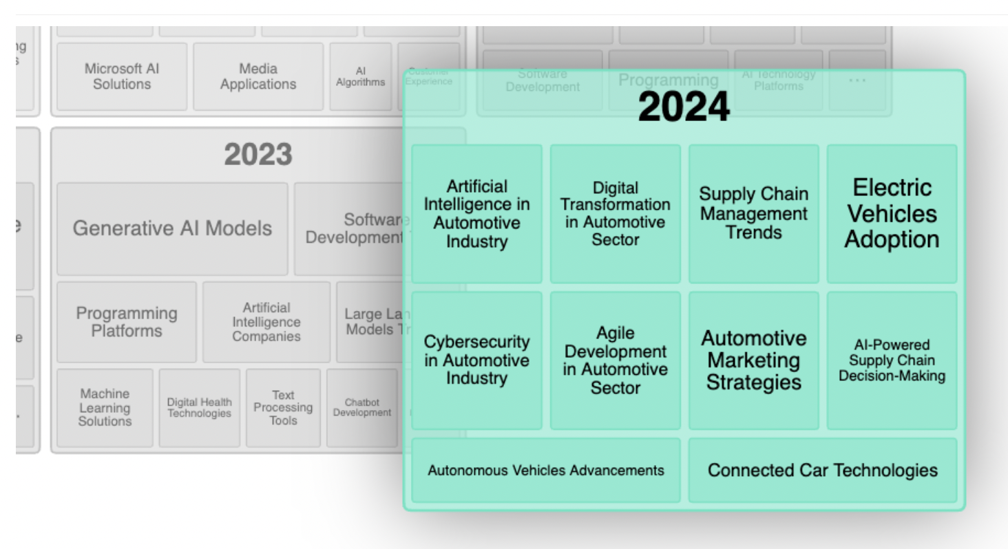 Volver a Blog AI The Revolution of the Generative AI (II): the Automotive Industry 22 May, 2024 What would happen if creativity were not limited to human imagination? In the era of Artificial Intelligence (AI), these questions are no longer just mere mysteries: machines now can learn and not only imitate, generating new ideas, designs, and solutions autonomously. Specifically, a new branch of Artificial Intelligence is completely transforming content generation: generative AI. In this series of blog posts in collaboration with Linknovate, we explore how this trend is redefining the boundaries of creativity and efficiency in key sectors, including healthcare, software development, automotive, and the entertainment industry. Automotive Industry Artificial Intelligence (AI) is also transforming the automotive industry by introducing innovative solutions that improve vehicle safety, efficiency and autonomy. Relevant topics related to genAI in the automotive industry in 2024. Source: Linknovate Within this sector, generative AI is playing a key role in two key areas: simulation and training, and sensor and perception fusion. Within the former, generative AI is revolutionizing the way autonomous vehicles are trained and validated by generating realistic driving scenarios. AI can create virtual environments that accurately mimic real-world conditions, allowing autonomous vehicle algorithms to be thoroughly trained and tested in a safe and controlled environment. These simulations let engineers fine-tune algorithms and validate their performance in different scenarios, ultimately leading to safer and more reliable autonomous driving systems. Generative AI applications in automotive. Records by year. Source: Linknovate But in the era of autonomous driving, sensor fusion and perception are also critical components in ensuring the safety and efficiency of vehicles on the road. Generative AI can improve the integration of data from various sensors, such as cameras, lidar and radar, to generate a comprehensive understanding of the vehicle’s environment. By fusing information from multiple sources, AI-based systems can accurately perceive the environment, detect obstacles and make informed driving decisions in real time. This capability is essential for autonomous vehicles to navigate complex traffic situations, anticipate potential hazards and react quickly to changing road conditions.